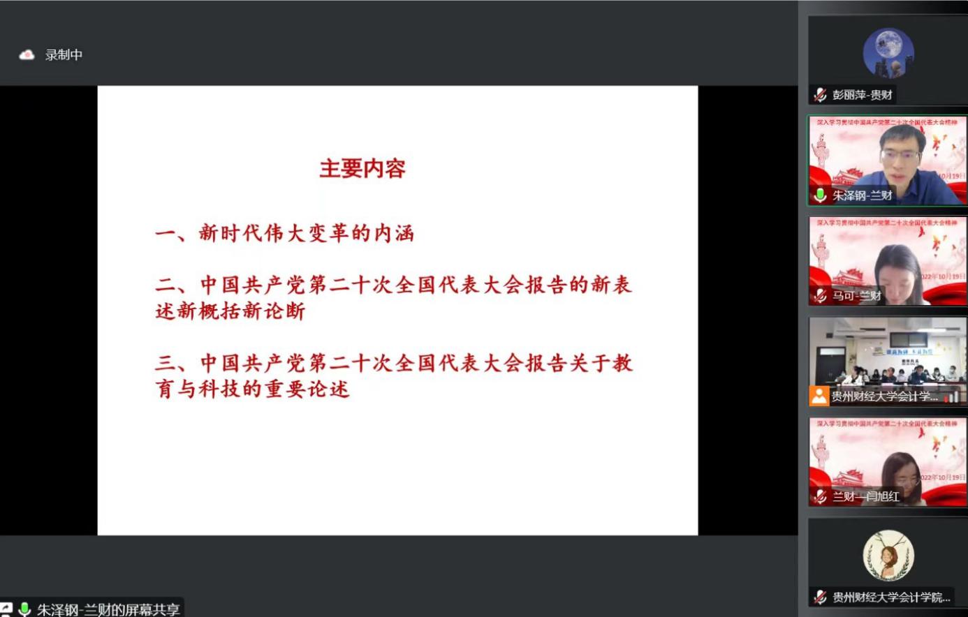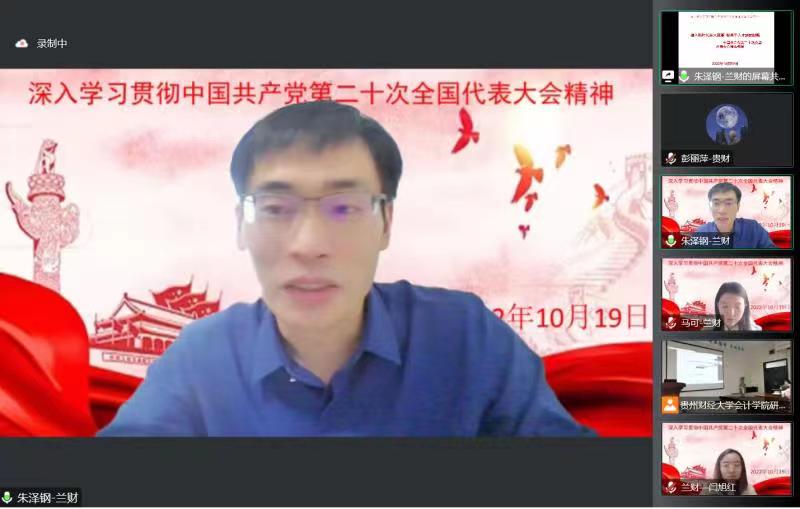 会上,兰州财经大学研究生院会计员工第四党支部书记朱泽钢同志作《融入新时代伟大变革 服务于人才强国战略》专题报告,从新时代伟大变革的内涵、党的二十大报告的新表述新概括新论断、党的二十大报告关于教育与科技的重要论述三个方面深入解读党的二十大报告,随后,双方党员同志围绕如何贯彻落实中国共产党第二十次全国代表大会精神开展研讨交流。