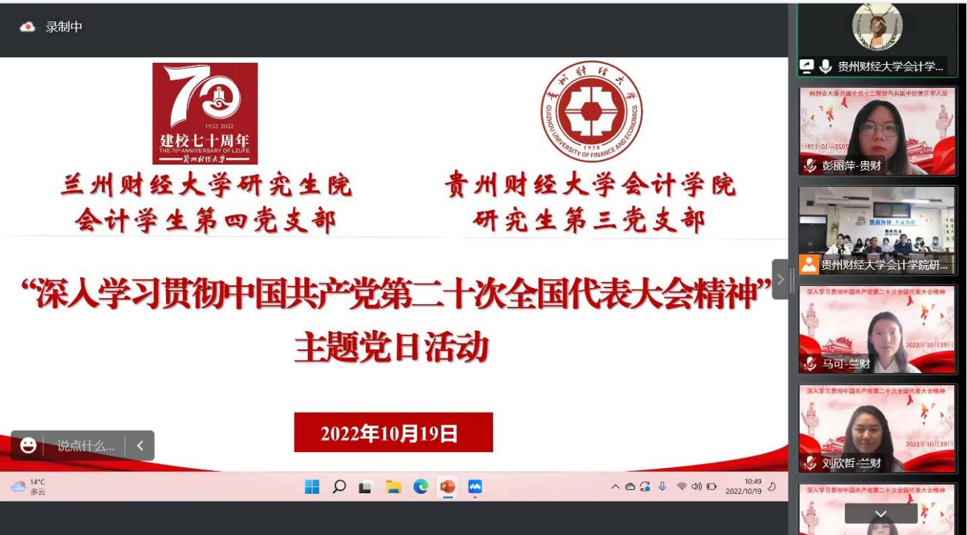 为进一步深入学习贯彻习近平新时代中国特色社会主义思想,深入学习贯彻中国共产党第二十次全国代表大会精神,促进基层党支部之间的交流,实现党组织优势互补。10月19日上午,WilliamHill体育研究生第三党支部与兰州财经大学研究生院会计员工第四党支部以线上线下相结合方式开展了以“结对共建促发展 齐心开创新局面”为主题的“结对共建”启动仪式暨“深入学习贯彻中国共产党第二十次全国代表大会精神”主题党日活动。