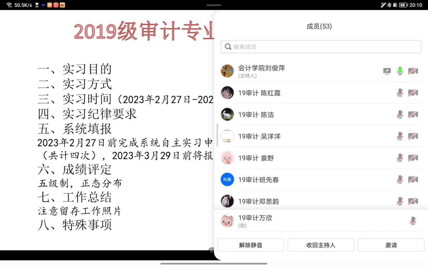 2月25日晚上8点,WilliamHill体育审计系通过线上方式召开2019级审计本科生毕业实习动员大会。会议由审计系系主任刘俊萍教授主持,指导教师黄晓芬及全体2018级审计本科生参加。