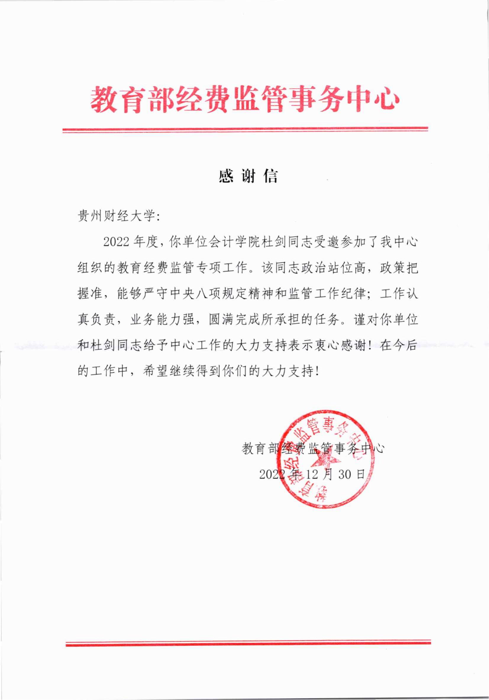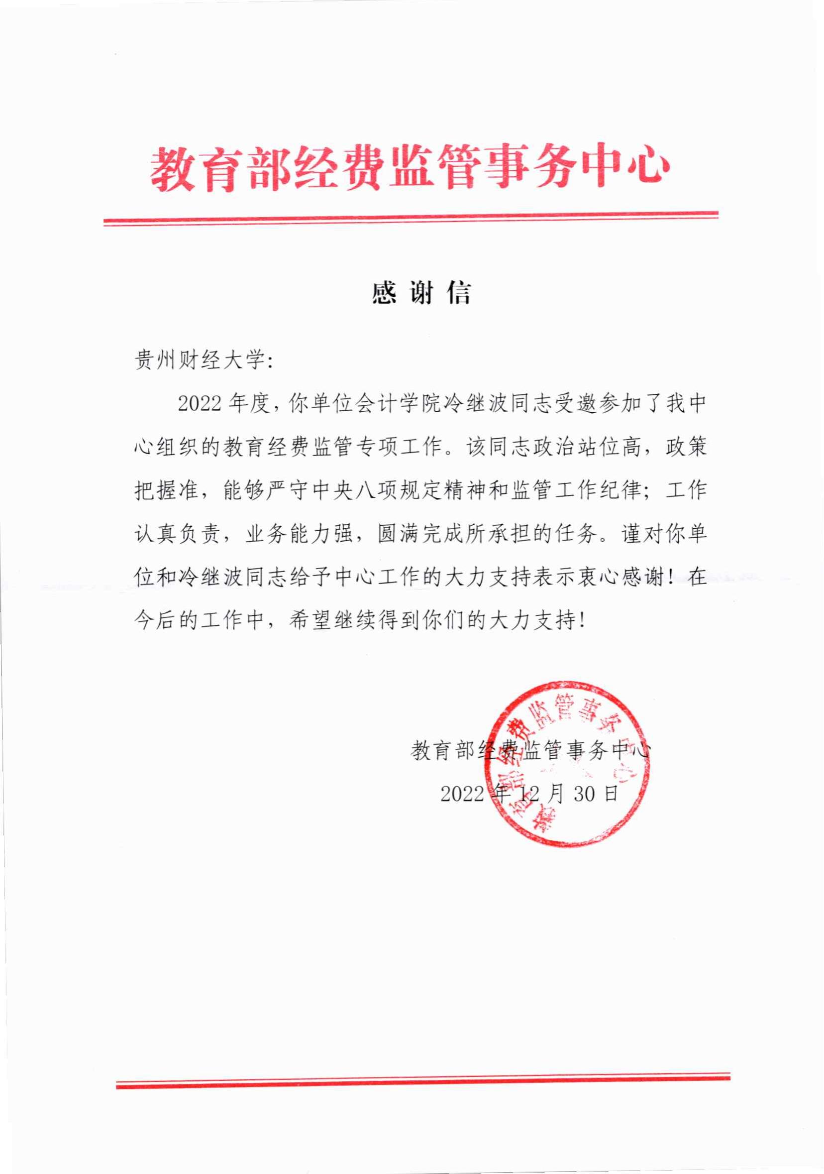 近日,教育部经费监管事务中心向公司WilliamHill体育发来感谢信,对公司WilliamHill体育党委书记聂永刚、经理杜剑、教授冷继波2022年参加教育经费监管专项工作表达了衷心感谢,并对三位教授的政治站位、业务能力进行了表扬。