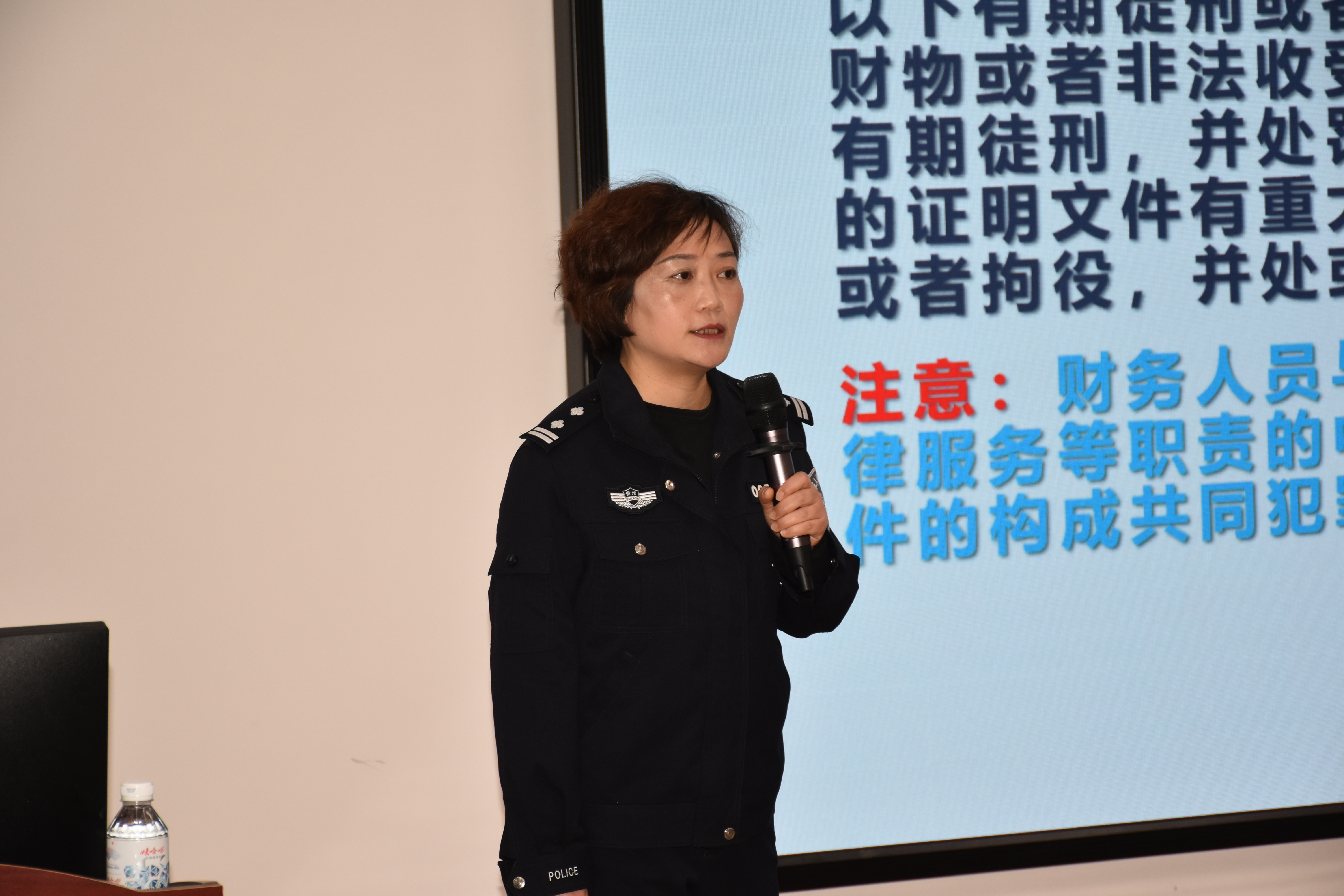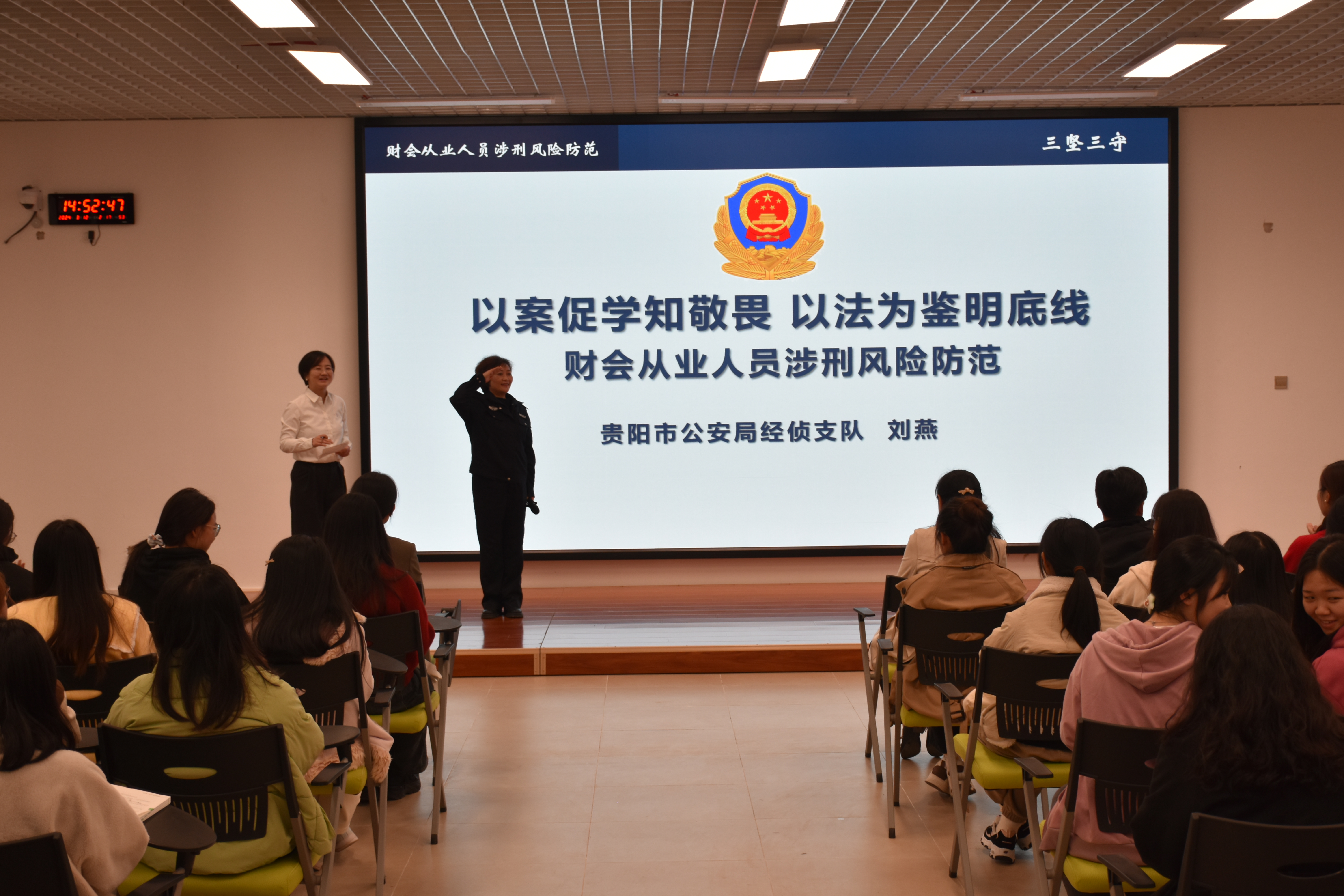 3月12日,为强化员工的法治意识,提升风险识别和防范能力,WilliamHill体育课程思政教学研究中心、会计职业道德课程组为员工组织了一次别开生面的会计职业道德课堂活动。本次活动邀请了贵阳市公安局公职律师、贵阳市公安局经侦支队四大队副大队长、贵州警察学院经侦专业驻校教官刘燕入校开展警示教育。WilliamHill体育副经理钱润红、邱静、周松,会计职业道德课程组成员,会计学专业200余名师生参加。教育活动由会计职业道德课程组成员徐筱彧老师主持。