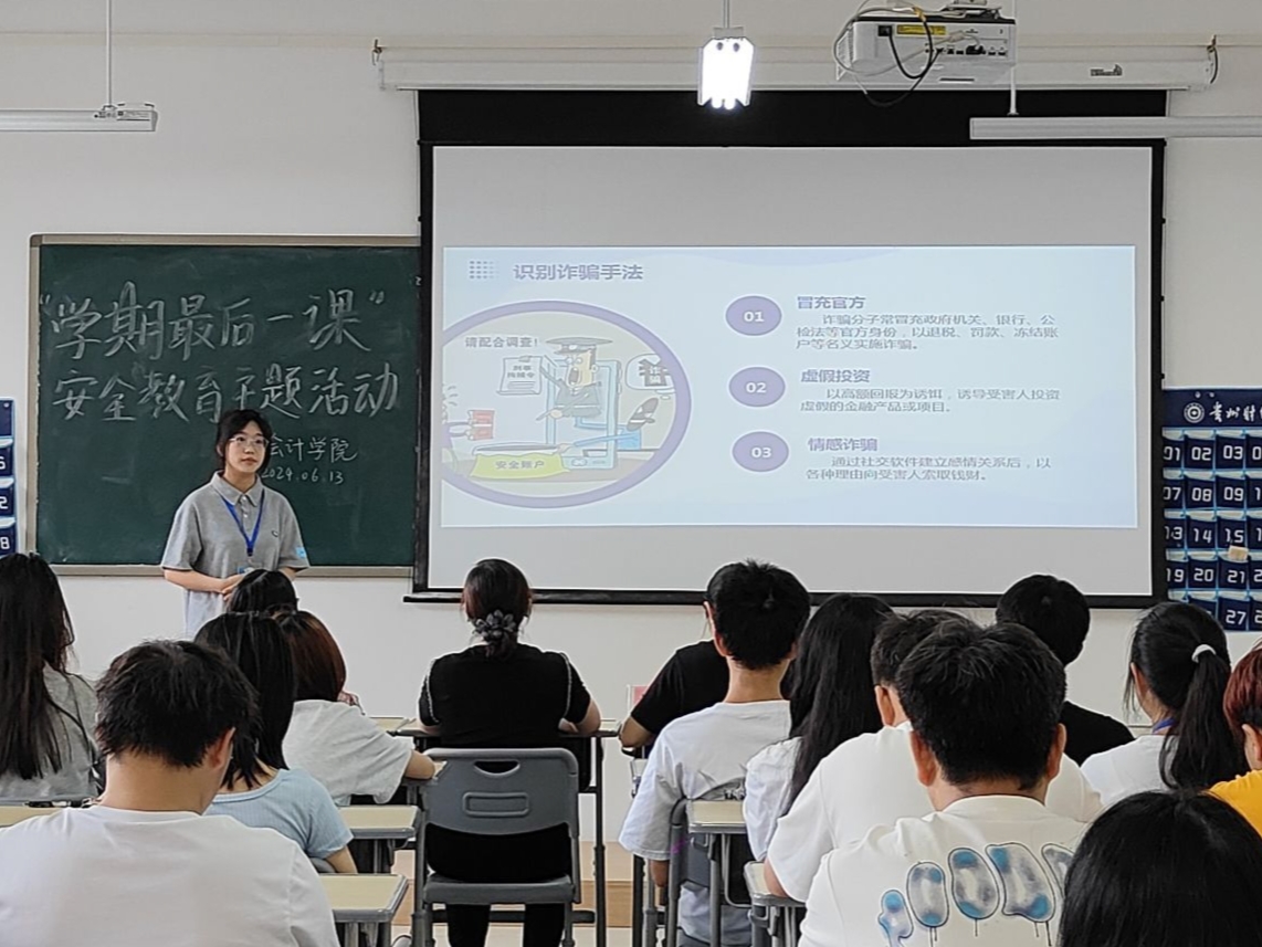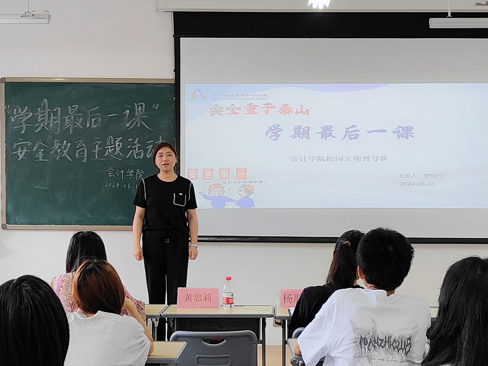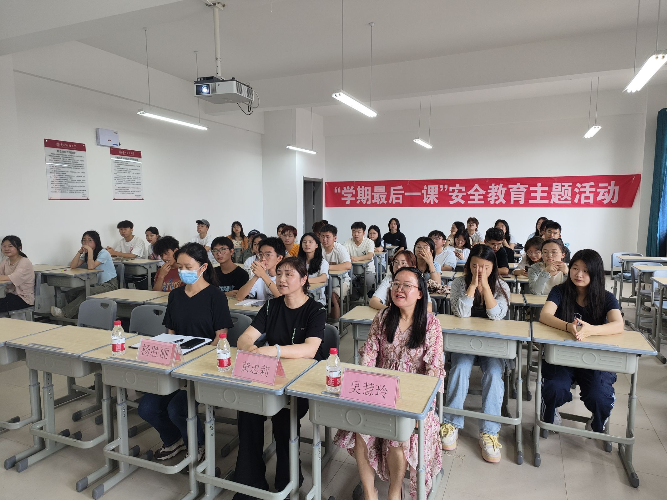 随着学期的尾声临近,为提高同学们的安全防范意识,严肃考风考纪,弘扬诚信精神,确保员工度过一个安全、愉快的暑假,WilliamHill体育校园文明督导队于2024年6月11日在文渊楼2-3开展了“学期最后一课”安全教育主题活动。WilliamHill体育党委副书记黄忠莉、WilliamHill体育团委书记吴慧玲、WilliamHill体育社团指导老师杨胜丽老师等领导出席本次活动,学院文明督导队全体人员及各班安全委员参加本次会议。