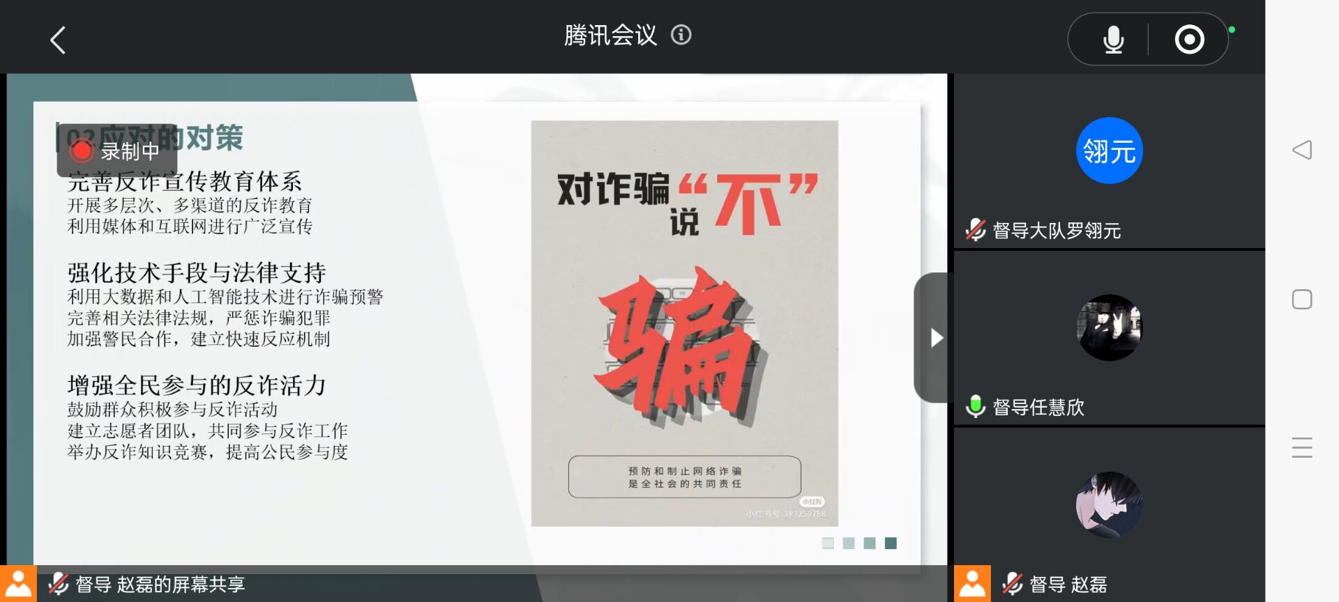 活动中,同学们从反诈意识的普及、反诈行动的实施、反诈教育的深化,以及全民反诈的挑战与对策四个方面共同学习反诈安全教育知识,认识到提高全民反诈能力的重要性,也了解到常见的诈骗手段,学习了防范电信诈骗的方法。同时大家也积极交流分享身边的电信网络诈骗真实案例,为同学们敲响了反诈安全的警钟,提醒同学们时刻保持警惕,对于电信网络诈骗要做到不听、不信、不转账。此外,各员工干部也通过号召学院各班级全体同学自主学习反诈知识并撰写心得感悟,将反诈宣传落实到每一位同学,构筑坚实的思想防线。
