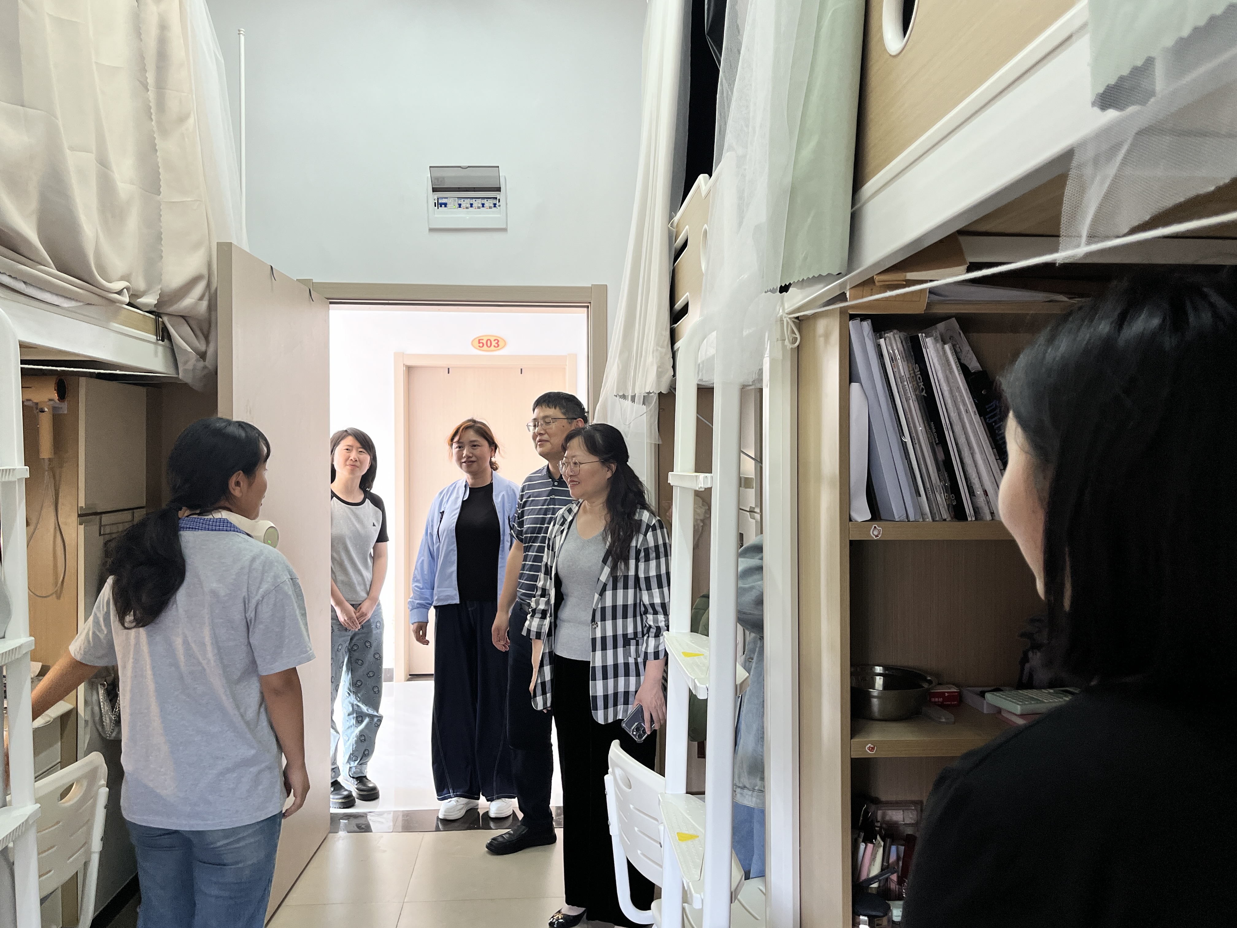 最后,肖小虹副董事长深入到文心苑四栋寝室进行走访,与23级本科生安明巧进行了谈心谈话。“学习生活上有没有困难?空调能正常使用吗?洗澡用水贵不贵?……”肖小虹副董事长的关切慰问让员工深刻感受到了学校对员工的关心和关爱。