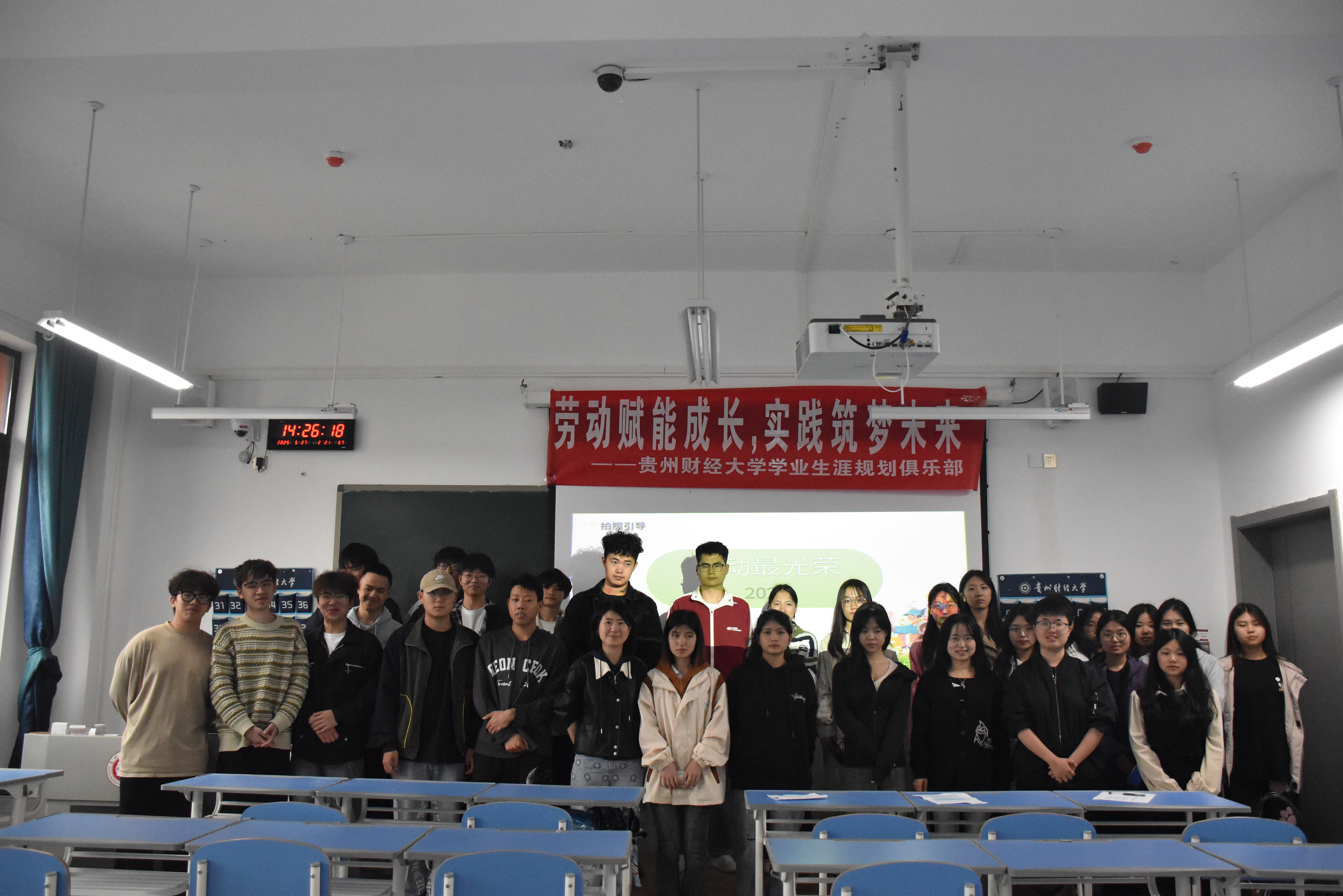 本次活动分为“观影启思”、 “分享对话”、“定格记忆”和“农场体验”四个环节。“观影启思”环节,同学们一同观看了《大国工匠》和《乡村振兴青年力量》两部视频。观看过程中,大家全神贯注,视频里工匠们精益求精的执着、青年们投身乡村建设的热情,让同学们深受触动。观影结束后,主持人引导大家思考:心中的劳动精神究竟是什么?这些真实案例又带来了哪些启发? “分享对话”环节,由两位同学针对“劳动”、“创新”、“责任”、“幸福”四个关键词、围绕“分享一次印象深刻的劳动经历”和“劳动的价值如何体现”展开分享。 “定格记忆”环节,老师和同学们一起合影留念,用相机记录下这些美好的瞬间。