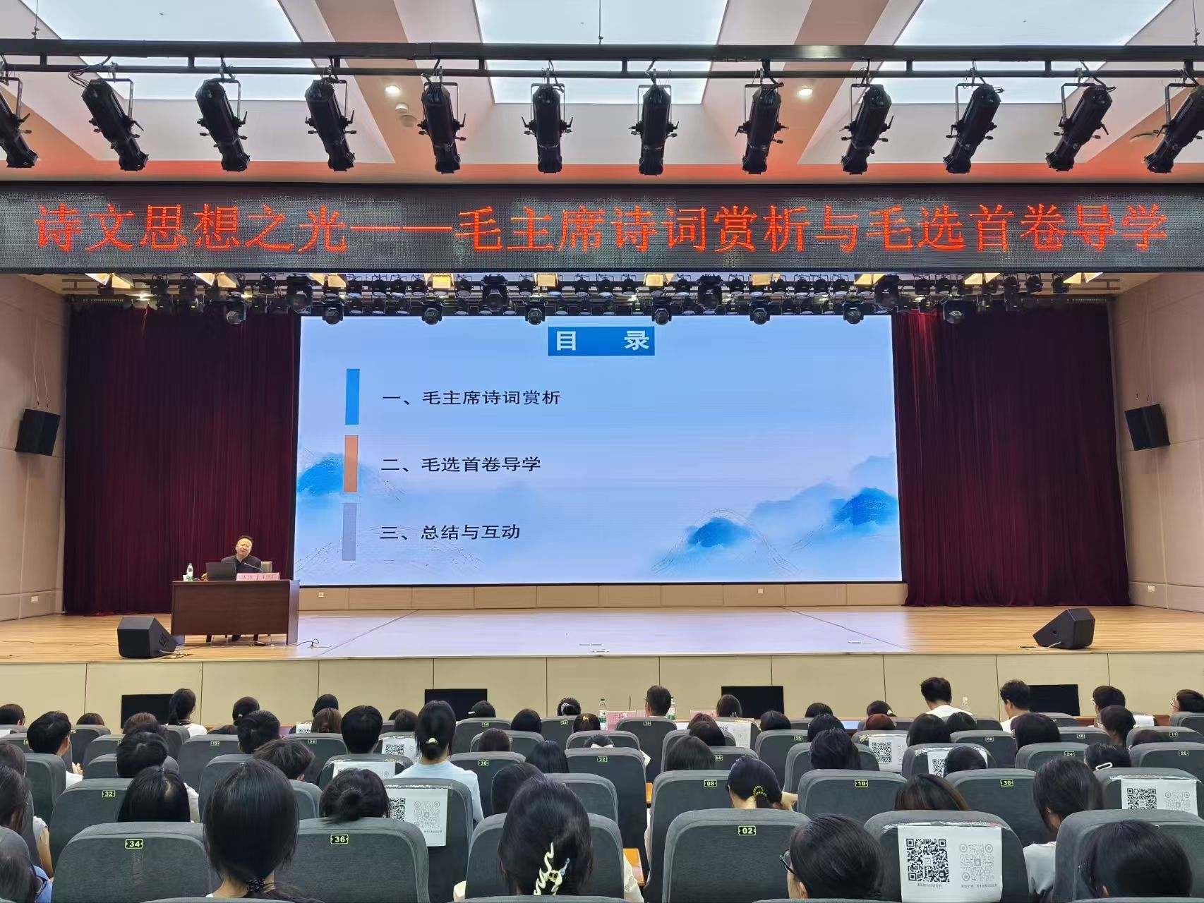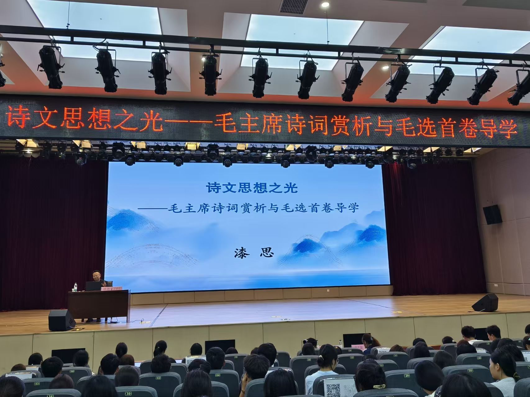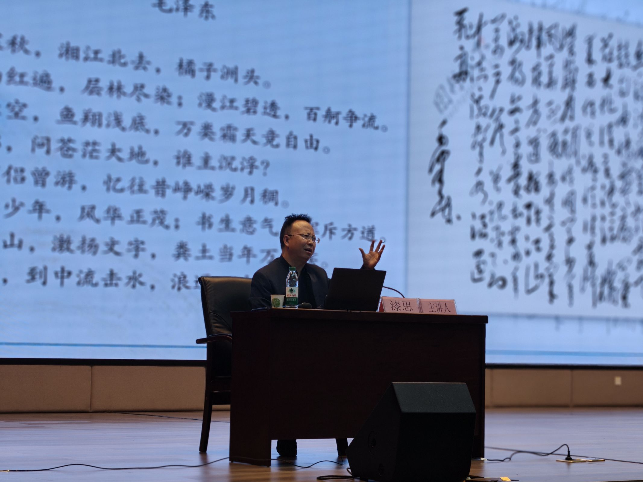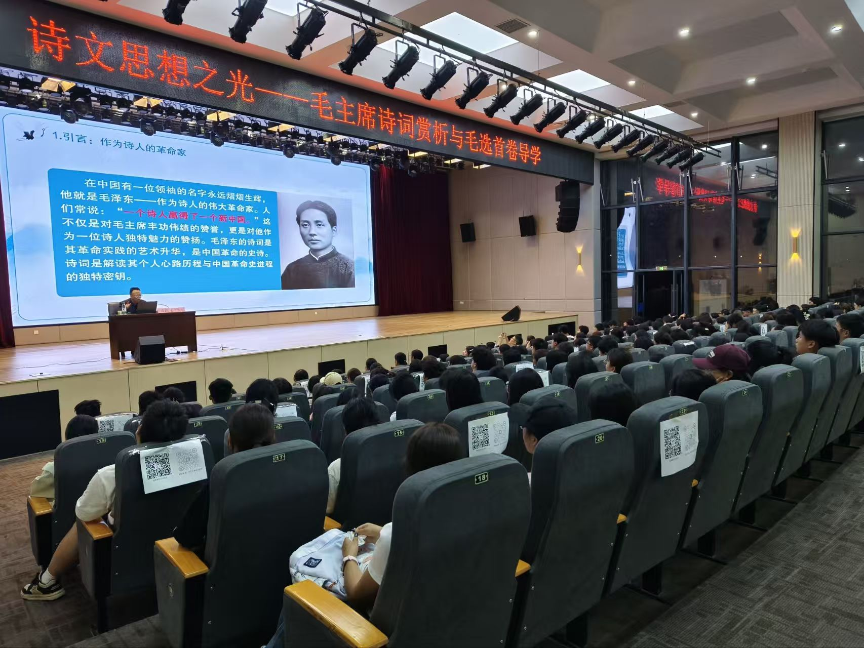 讲座现场,漆思教授时而激情澎湃地诵读诗词,带领大家感受其中的磅礴气势;时而深入剖析词句内涵,让同学们领会革命先辈的精神境界。同学们聚精会神,完全沉浸在诗词文章所承载的革命精神与文学魅力中。整场讲座,掌声如潮,此起彼伏。