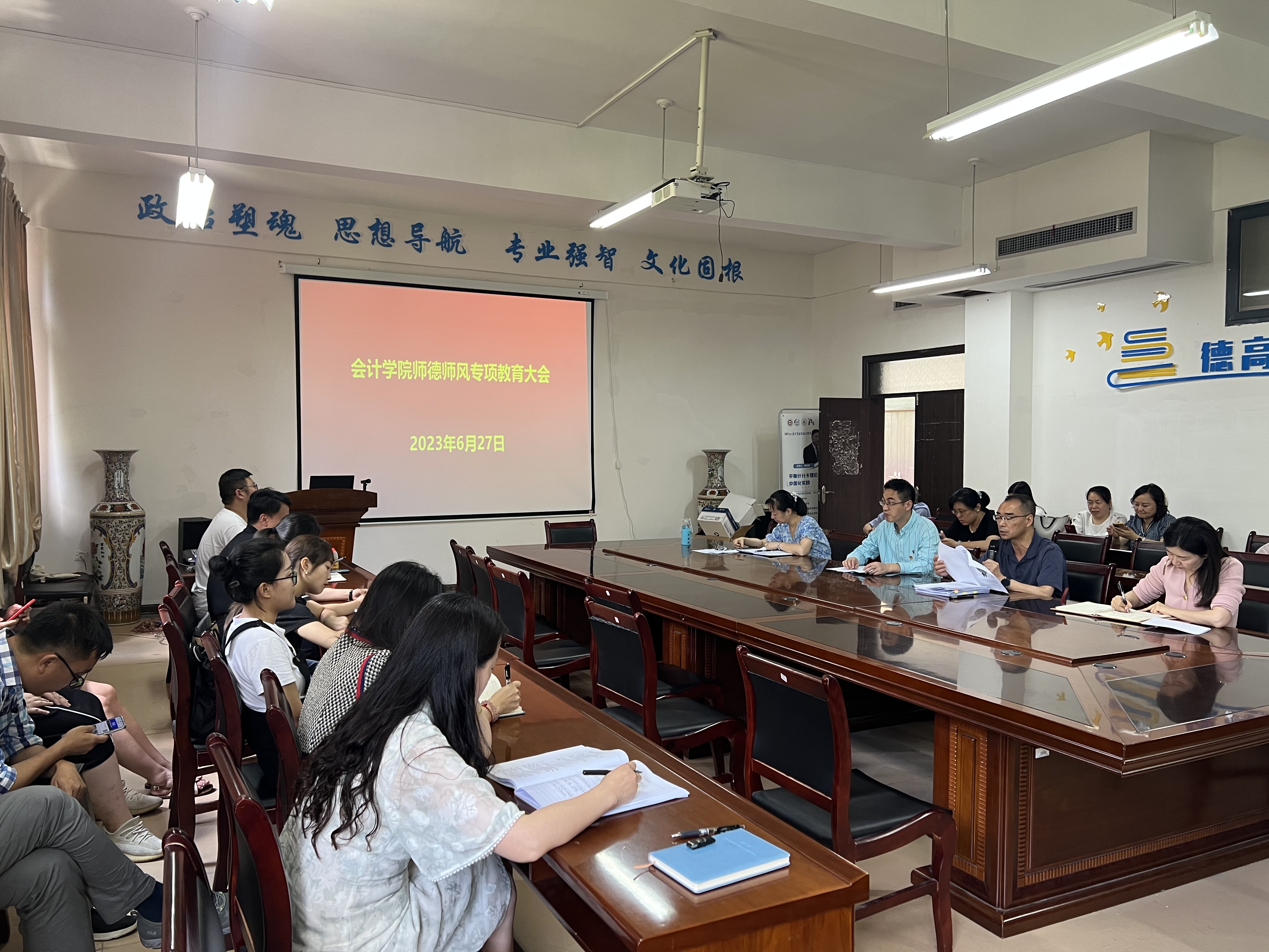 最后,聂永刚强调,建设社会主义现代化强国,对教师队伍建设提出了新的更高要求。要结合深入开展学习贯彻习近平新时代中国特色社会主义思想主题教育,把师德师风建设摆在更重要位置,切实增强广大教师为党育人、为国育才的责任感、使命感和紧迫感。全体教师不仅要了解底线、不碰触底线,更要追求高线,按照“四有”好老师的标准严格要求自己,学院层面要做好师德师风建设,严格把握“一票否决”。广大教师要牢记习近平总书记的殷殷嘱托,提升个人修养,明大德、守公德、严私德,围绕“立德树人”根本任务,为服务国家重大战略需求和推动高层次财经大学的建设做出更多贡献。