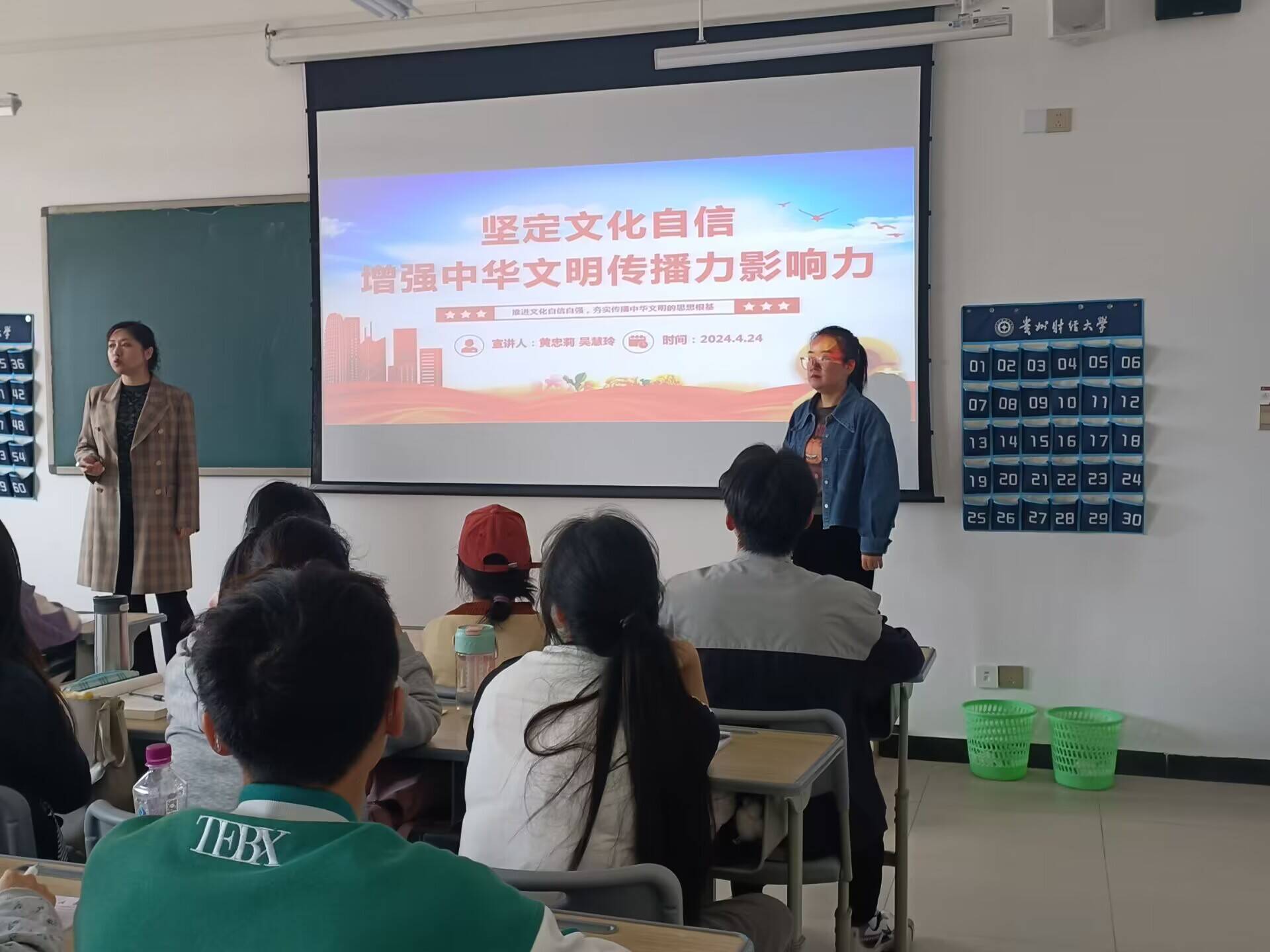 4月24日,WilliamHill体育党委副书记黄忠莉、团委书记吴慧玲在文渊楼2-1教室为员工开展了“坚定文化自信,增强中华文明传播力影响力”理论宣传二人讲活动。