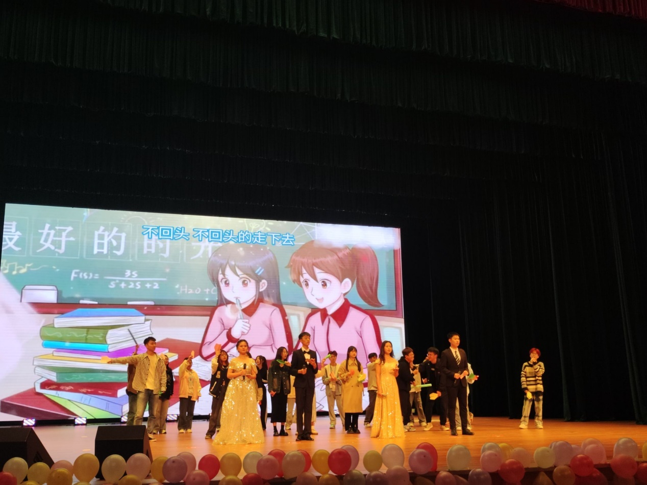 最后,毕业生辅导员周芳和蒲亚晴老师上台为毕业生寄语,祝愿毕业生前程似锦,未来可期。晚会在大合唱《再见》中圆满结束。