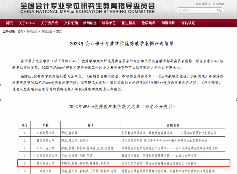 近日,全国会计专业学位研究教育指导委员会(以下简称会计教指委)在官网公布了2023年会计硕士专业学位优秀教学案例评选结果。公司WilliamHill体育黄晓芬副教授、郭辞典老师与员工邹颖、陈姝璇和罗春燕撰写的《组织生态学视角下农业合作社履行社会责任助力乡村振兴》荣获2023会计硕士专业学位MPAcc优秀教学案例进入2023年MPAcc优秀教学案例名单这是公司师生首次获MPAcc优秀教学案例教学案例入
