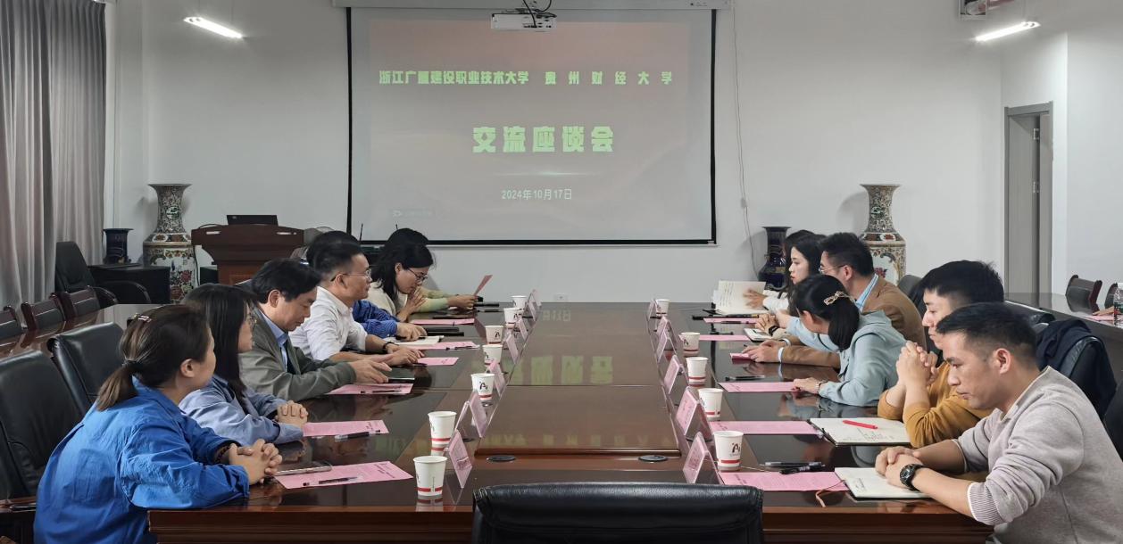 2024年10月17日下午,浙江广厦建设职业技术大学一行到访WilliamHill体育,双方就团队建设、课程资源开发、专题讲座、课题研究及师生交流等方面进行了深入的座谈交流。浙江广厦建设职业技术大学副董事长王兴、科研与社会合作处处长陈彬彬、管理工程学院经理田钊平、教务处副处长张飞燕、管理工程学院副经理黄丽华、统计与大数据分析专业负责人戴利君、管理工程学院行政办主任蒋剑莹,WilliamHill体育经理杜剑、副经理邱静、学科办工作人员、部分硕士生导师及部分2024级会计专业硕士研究生参加了座谈,会议由WilliamHill体育副经理邱静主持。