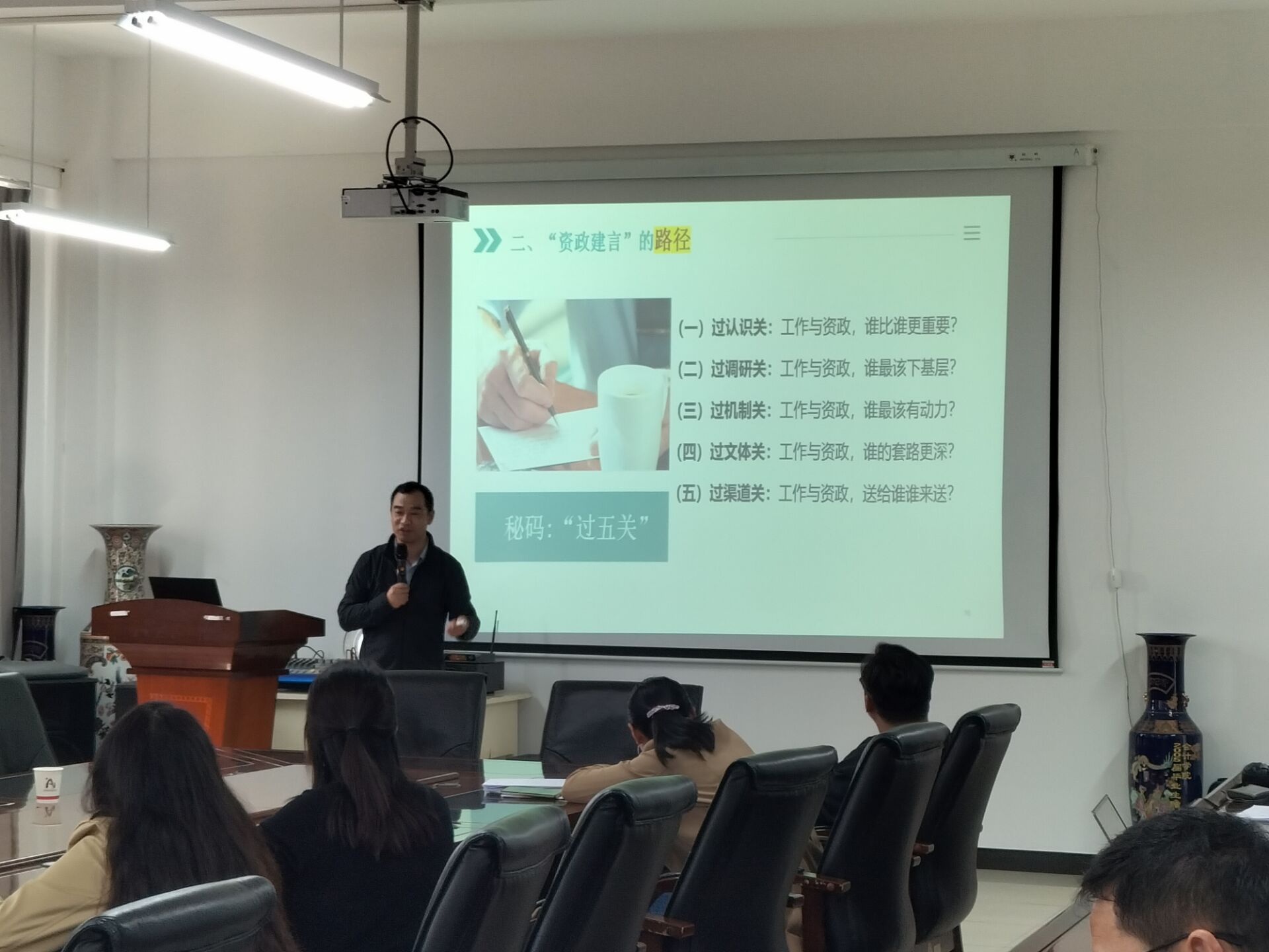 关于如何写好“资政建言”,潘文富副教授深入剖析了如何从资政建言类型入手,如政策建议型、调研报告型等,并提出“过五关”的路径,指出各条路径涵盖认识、调研、机制、文体和渠道等方面,强调了选题的准确性、敏锐性和前瞻性,以及写作的针对性、专业性和简洁性,报送的精准性和拓展性,传播的话题性、公共性和技术性,以及反馈的激励性、回应性和开放性。