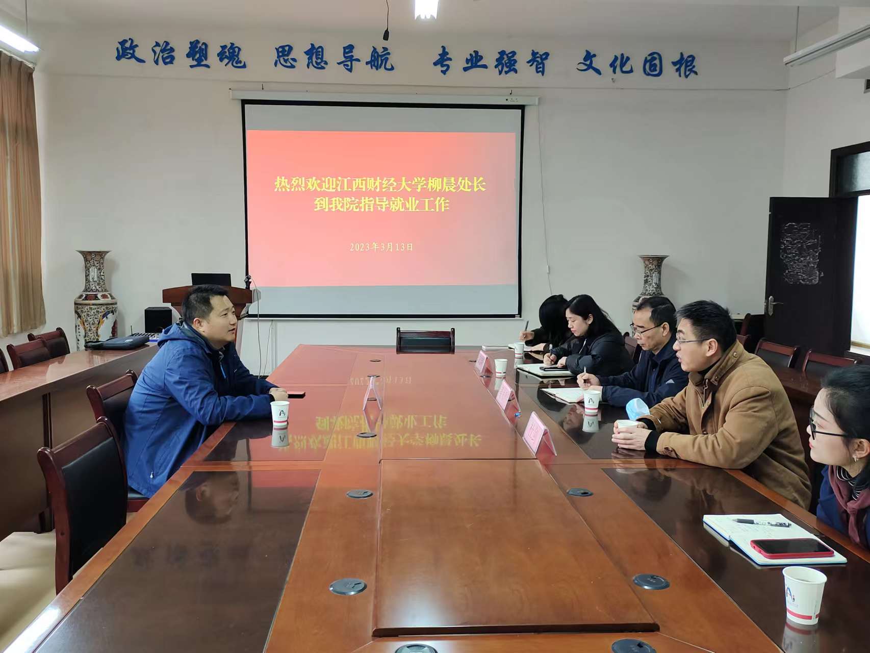 为进一步做好毕业生就业服务工作,提高公司2023届毕业生就业工作质量,2023年3月13日,江西财经大学招就处处长柳晨受邀到学院交流就业工作,公司党委书记聂永刚、经理杜剑、党委副书记黄忠莉以及毕业班辅导员蒲亚晴、张筱悦到场参加交流会议。