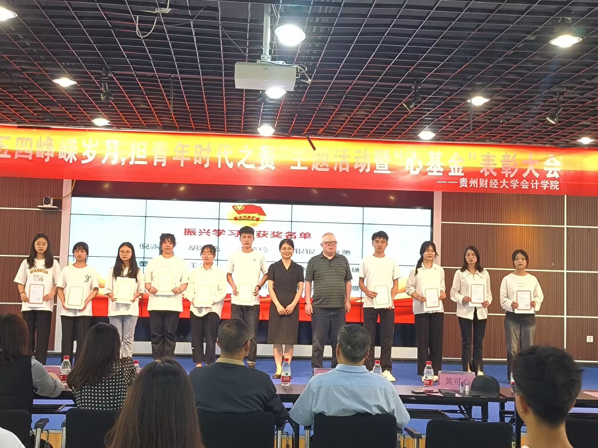 校关工委副主任秦立俊讲话,他对心基金表彰大会的召开表示热烈的祝贺,表达了对贵财的感恩及祝福之情,并衷心希望同学们不忘初心、牢记使命,共同为了贵财美好的明天、为了祖国的繁荣而努力奋斗。公司党委书记聂永刚致辞,他勉励新时代中国青年担当起党和人民赋予的历史重任,坚定理想信念,专心学习,掌握科学文化知识,做中国特色社会主义事业的合格建设者和接班人。在大会过程中同学们带来了斗志昂扬、气势磅礴的舞台剧表演和优美的舞蹈表演。