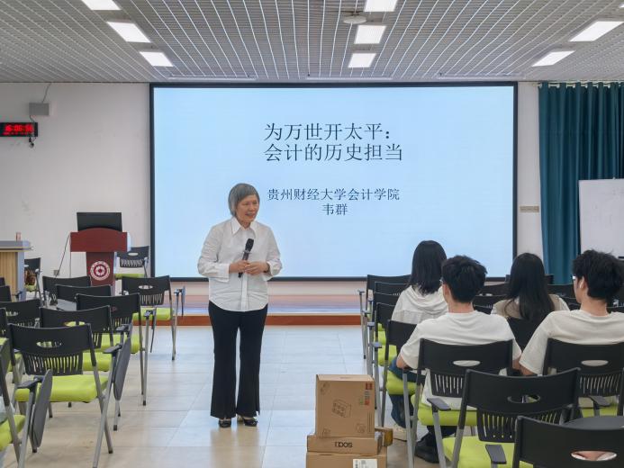 韦群老师强调,同学们要树立报国之志,将个人职业发展融入民族复兴的伟大征程,助力我国从会计大国迈向会计强国。同时,要通晓会计历史,以史为鉴,拓宽视野,为会计领域的发展贡献智慧。更要熟谙会计规范,提升实务技能,避免纸上谈兵,在实际工作中脱颖而出。