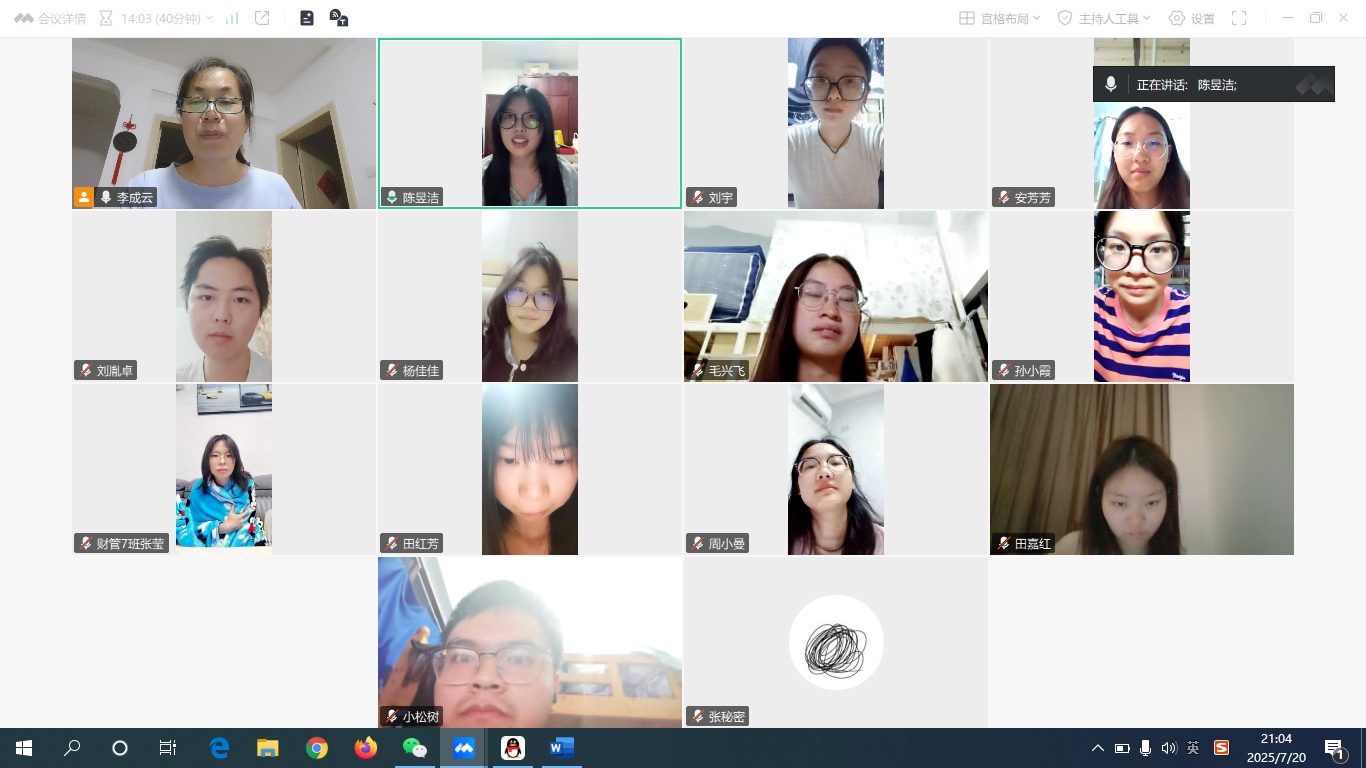 2025年7月20日,WilliamHill体育财务管理专业的实习指导老师李成云通过腾讯会议了解同学们实习具体情况,一共有12名同学参加了交流,其中有6名2022级财务管理1班在贵州智软科技有限公司集中实习的同学,另有6名分散实习的同学。在李老师的主持下,同学们就实习单位基本情况、实习岗位、实习期间的工作安排、实习单位导师安排情况及实习期间遇到的问题进行了深入交流。